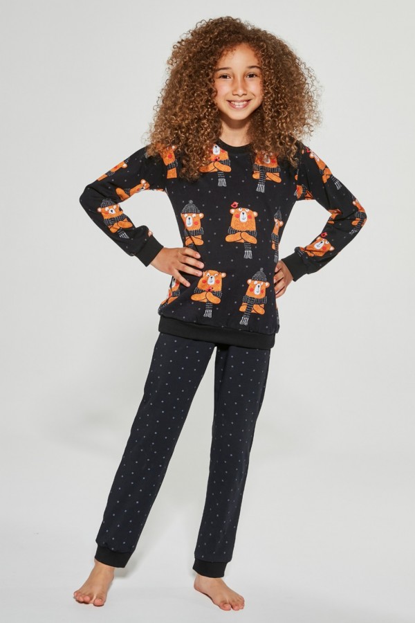 Pijama pentru fetite realizata din bumbac de inalta calitate. Pijamaua este compusa din doua piese. Bluza are maneca lunga, decolteu rotund si prezinta model colorat cu ursi de plus si cu buline, iar pantalonul este lung, are talie elastica confortabila si prezinta model deosebit cu buline mici. Manecile, decolteul, pantalonul si partea inferioara a bluzei sunt finisate cu mansete uni.